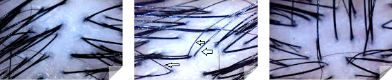 The projection for balding in the future will be determined by the area where miniaturization exceeds 20 percent (there are about 20 percent normal vellus hairs that look just like miniaturized hairs but are not). Miniaturized hairs have arrows pointing to them in the middle picture. Click to enlarge.