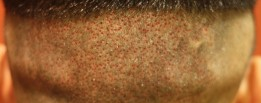 I have been asked lately to show more pictures after the surgery so that prospective patients can understand what they may look like. Each patient is different because of hair and skin color. The lower the contrast, the less detectable it is, the grater the contrast the more detectable the ‘beard look’ of new hair is. This patient is 9 days after his surgery. His skin color is olive but his hair is brown so what we are seeing is his brown hair in the recipient area against his olive skin color and an FUE donor area that is one day post-op. Note that there is no crusting present in the recipient area and the FUE wounds are almost undetectable at one day.