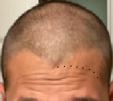 Set 1 (below): Photo on the left is of a patient shown with the “mature” hairline drawn in. The photo in the middle on the right is of that same patient with the “juvenile” hairline drawn in (the lowest line paralleling the highest crease of the furrowed brow). Note the gap between the highest wrinkle and the proposed mature hairline. That ‘gap’ should not be transplanted. The photo on the below is of my hairline — a classic mature hairline. Click photos to enlarge.