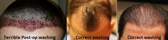 I don’t like the idea of anyone removing grafts that have scabs on them because we have published a paper in a formal medical journal, that when a person pulls off a scab (crust) from a recipient area in less than 12 days, the risk of losing the graft is very high. Put a shampoo on your head and let it sit for 10-15 minutes, then gently work the crusts with your fingers. This will take days to get the crust off so that you do not disturb the grafts. See the medical paper we wrote in a major journal below in the web reference that proves my point. Look at the two patients on the right, both one day after FUE sessions and both clean without crusts.