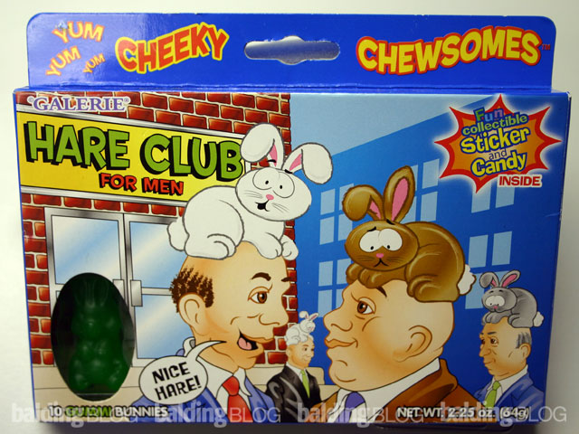Try Hare Club for Men, where you can get a nice hare to show off to you friends. The Hare Club for Men package includes 10 Gummi Bunnies and a fun collectible sticker in the fancy box shown below. About 300 calories for the whole box and zero grams of fat, it works for the diet conscious person. Our society exploits the balding process as illustrated here in this cartoon. Some of my readers are too intense so this entry will better prepare you for the more serious entries below.