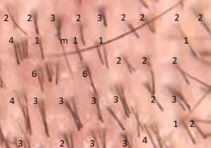 There are two important numbers to determine from the hair in this zone (1) the hair count per follicular unit (these are the groups of hairs that contain one or more hairs each in them) and the thickness of the hair shafts of this permanent hair (never look at the hair you are losing as normal hair as it often gets thinner and thinner). I quantify the thickness of each hair shaft in the permanent zone by feel (experience helps here) or with a micrometer as Fine (~40 microns or less in thickness), Average (~60 microns in thickness) or Coarse (70+ microns in thickness).