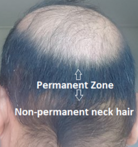 First let’s see where the permanent zone of hair can be found. It is called the permanent zone because even the baldest of men, never lose hair in this zone (see photo below). The zone measured from 2.5-3 inches in height and extends around the entire head from temple prominence on the right side to temple prominence on the left side. We generally assume (safely so) that this hair will always remain (regardless of the balding pattern a man develops). Back in the late 1950, a doctor ‘Orentriech’ discovered that if this hair is moved anywhere on the body, even into a bald area of the scalp, it would grow as it would have grown in its home location in this permanent zone. That is why it is called the permanent zone of hair.